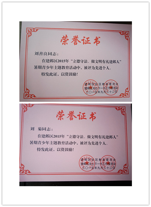 积善社区五老同志和社区教育专干在2015年暑期活动中,荣获先进个人。