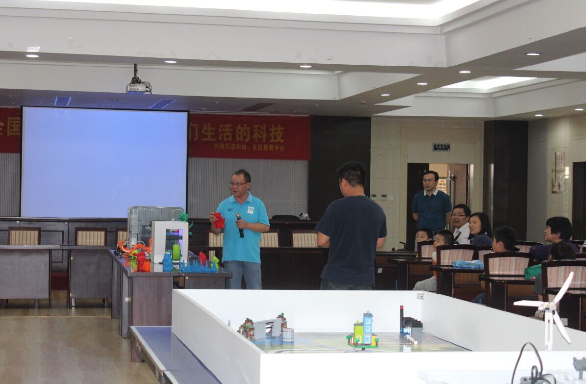 活动首先由兴隆街道社教办胡老师系统介绍3D打印技术的原理、发展及使用前景。胡老师的讲座深入浅出,使用了大量的图片、视频,将3D打印这一制造业领域的前沿科技形象生动地展现在大家面前。随后,3D打印机进行了现场打印,并展示了成果,大家被3D打印的神奇魅力深深吸引了。