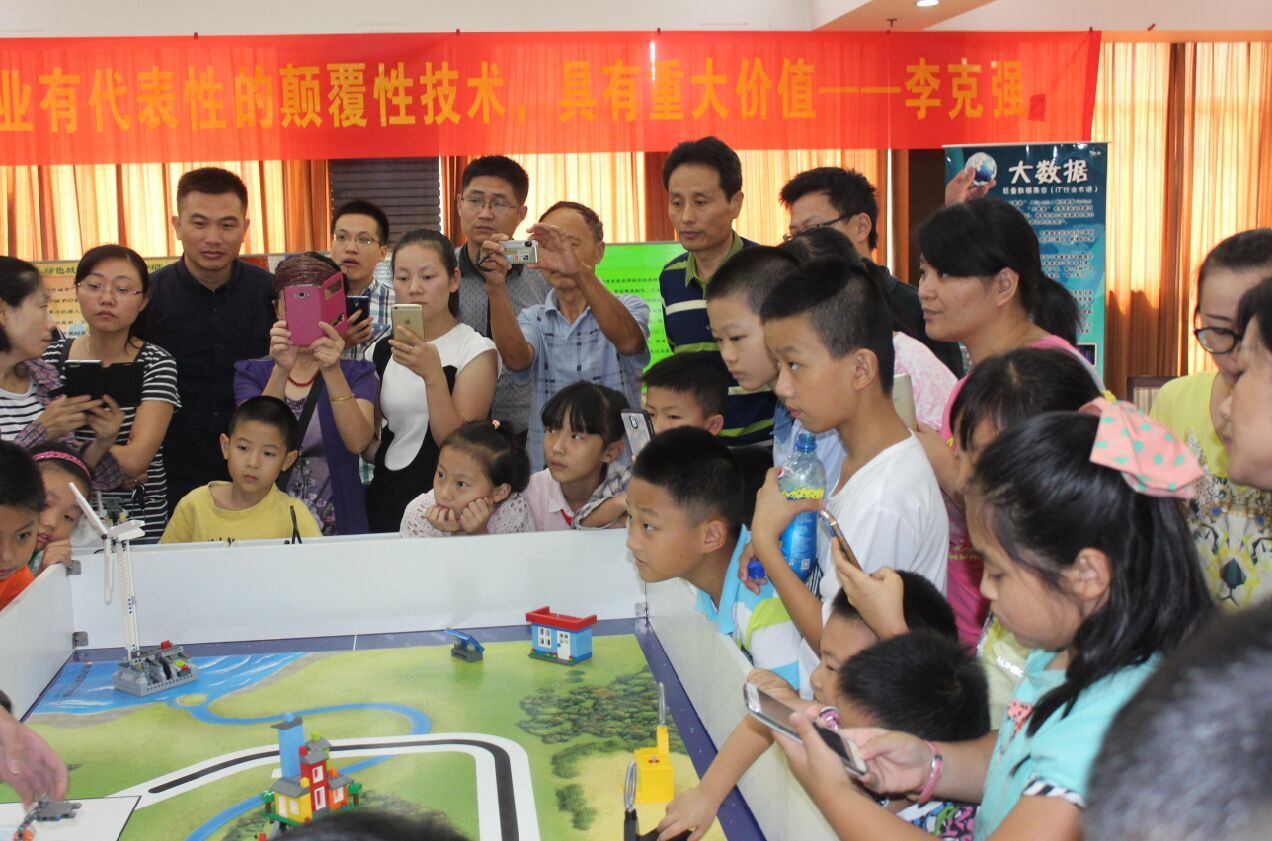 随后,建邺高中科技社进行了“绿色城市”项目机器人表演。科技社的同学们在薛磊老师的指导下,现场搭建好各种机器人。机器人按照编制好的程序实施了驱动风力涡轮发电机运转、调整水坝流量、分拣垃圾、配置城市烟囱等工作,向人们展示了保护环境与自然和谐相处的理念。表演现场人头攒动,深受现场观众特别是青少年朋友的喜爱。