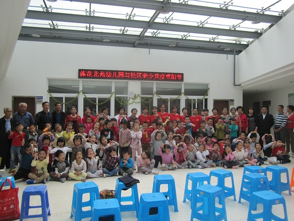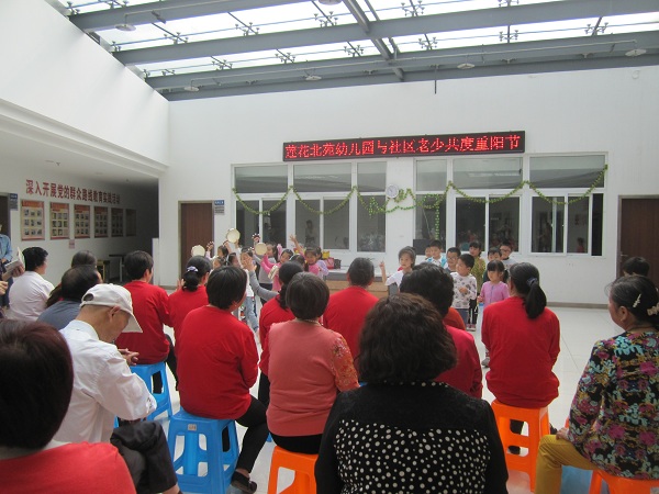 2015年10月21日,今天是重阳节,莲花北苑社区活动大厅像迎接重大喜庆日子一样热闹非凡。在这里,莲花北苑幼儿园大班60位快乐的小天使和莲花北苑社区老年文艺团队成员们欢聚一堂,共度重阳节。活动现场,小朋友们首先向爷爷奶奶们送上了重阳糕、手绘贺卡等小礼物,并祝愿爷爷奶奶身体健康,还与爷爷奶奶拥抱,场面温馨而感人。而后小朋友们带来了古诗朗诵、《葫芦娃》、铃鼓表演、武术操等节目,认真却又充满童真童趣的表演赢得了观众热烈的掌声,也将活动氛围引向高潮。为表达对莲花北苑幼儿园小朋友们的感谢,莲花北苑社区舞蹈队也带来了精彩的舞蹈表演,场下的小朋友在美好的氛围下也随着音乐跟着爷爷奶奶们翩翩起舞。活动尾声时,老少欢喜合影。短暂的相聚让他们迅速产生了感情,离开时依依不舍,相互拥抱,相互挥手告别。