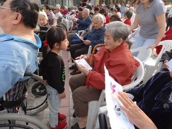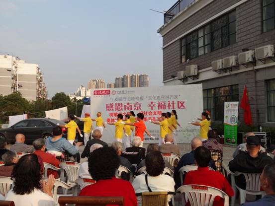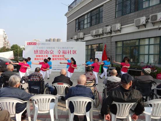 “天生易老天难老,岁岁重阳”。2015年10月20日,重阳节来临之际,奥体社区艺术团及社区共建单位省妇女儿童活动中心、奥体艺术幼儿园、金陵图书馆及社区部分在职党员来到南京市万福园敬老院为老人们带来了一场别开生面的文艺演出。舞蹈、拳术、孩子们欢乐的表演及怀旧的老歌都让老人们乐开怀,91岁的张奶奶说:今天这么人来看我们,高兴!