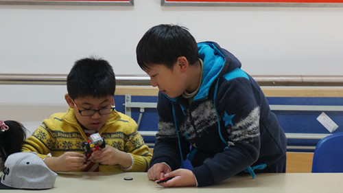 2015年11月28日的走进科技的魅力课堂,专业机器人老师给同学们讲解了前轮驱动和四轮驱动汽车的区别,同时带着同学们利用手上的材料实现了前轮驱动四轮电动车的组装和“试驾”,男同学更是突发奇想,在四轮车的基础上升级了多轮车。
