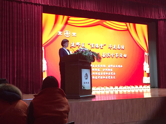 活动有五个流程,一是中胜“宣德堂”负责人孙连娟分享“宣德堂”成立以来的那些事儿,二是区委宣传部部长汤志平进行“宣德堂”工作点评,三是正式授予了吴融芳、徐玥、华仔义剪队、蕾党员义务医疗服务队首批“宣德堂”文明使者称号和奖杯,四是由最年长的志愿者吴融芳老人和蓓蕾宣德堂负责人吴锋先生进行了两段文明、道德宣讲,最后市委常委、宣传部部长徐宁,区长闵一峰对宣德堂进行最终总结讲话。