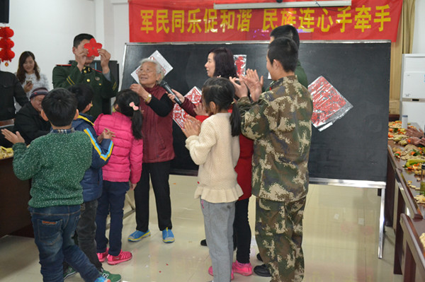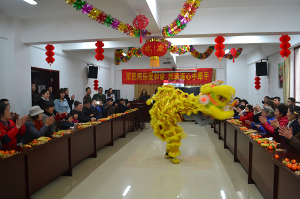 首先由街道叶主任为活动致辞,社区道德模范郑寿香为部队官兵送上小笼包。在活动中,部队官兵为大家带来了高难度的舞狮表演,得到了热烈欢迎;之后进行了你比划我来猜、我是神投手、一切行动听指挥等多样游戏,无论老少都积极参与,与部队官兵自由组合,大家互相结成队进行PK,玩的是不亦可乎,还有剪纸达人为大家现场传授剪窗花秘诀,最后一同欣赏了军体拳表演,在大家的一片欢声笑语中结束了这次活动。