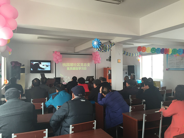 2016年3月2日,桃园居社区在社区中心会议室召开3月份党员固定学习日活动。通过远程教育平台观看基层社区党建方面的电教片,开展“学党章党规、学系列讲话、做合格党员”的学习。通过学习推动党员教育的全面化发展,使广大党员增强政治意识,坚定理想信念,发挥党员的模范作用。
