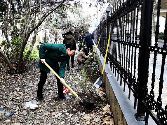活动现场大家拿着水桶、铁锹等劳动工具,来到植被稀少的围墙边挽起衣袖,挥动铁锹,挖土种树,一片忙碌的景象。在大家共同努力下,此次共植各类树苗一百多棵,使社区环境得到了很大改善。