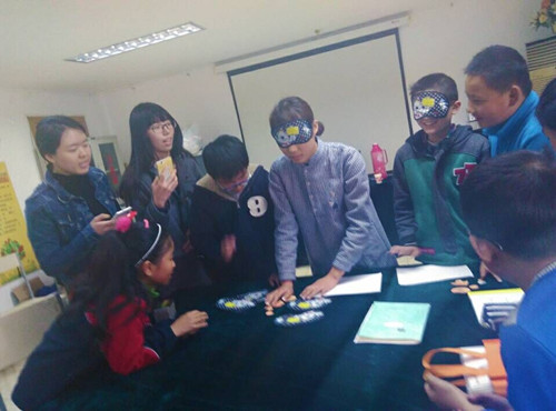 蒙眼拼图游戏中,一位同学需要指挥另一位戴着眼罩的同学把被打散的各个部分拼成一张完整的图案,这是对两个孩子表达和理解能力的双重考验。