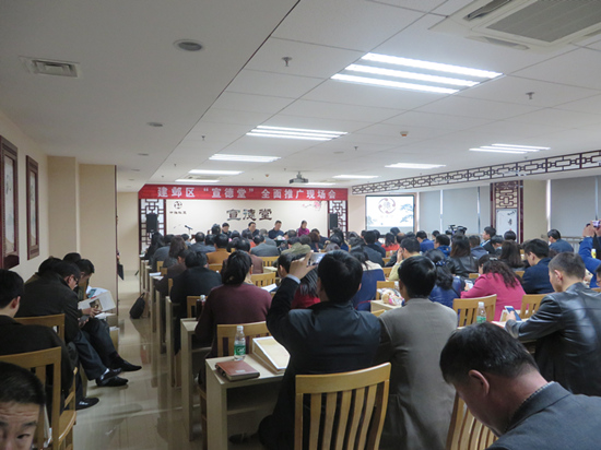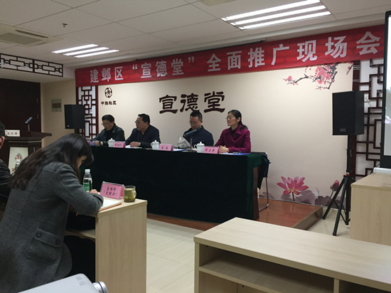 区委副书记曹曙在推广会上作出重要讲话,对宣德堂提出“12345”,“一个平台”统一的微信公众平台,“两个队伍”志愿者队伍、社区公益组织队伍,“三个有”有相对固定的场所、有统一的标识、有社会主义核心价值观氛围,“四个关系”宣德堂与社区的关系、公益服务与志愿服务的关系、宣德讲堂与平台的关系、短期活动与长期发展的关系,“五个目标”即群体整合、道德教化、心理调适、文化认同、社会治理。