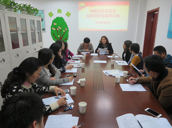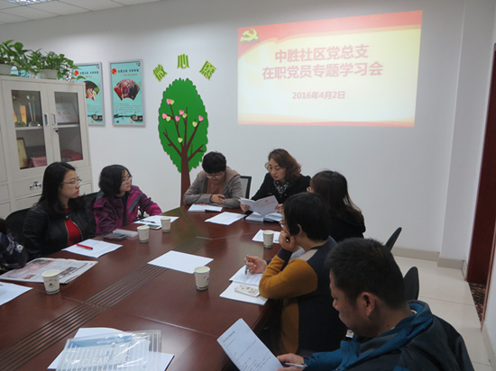 为规范在职年轻党员组织生活,提升在职党员学习参与度,4月2日上午,中胜社区党总支召开在职党员专题学习会。会议由中胜社区党总支书记昌莉主持召开,一是在职党员见面学习,昌书记宣读《条例》、《准则》学习内容,要求在职党员贯彻中央“学党章党规、学系列讲话,做合格党员”精神,总支近期将购“两学一做”手册组织学习,二是做《中胜社区在职党员调查问卷》了解年轻党员的诉求、想法,三是进行面对面的讨论,杨大卫表示年轻党员活动应该多样化,利用微信等现代通讯方式进行沟通,建立微信群,定期发送学习文件,也可对最近热点问题进行讨论,发表自己的观点,在职党员工作较忙,希望能在周末或者晚上安排学习,也可安排电话会议进行组织生活。