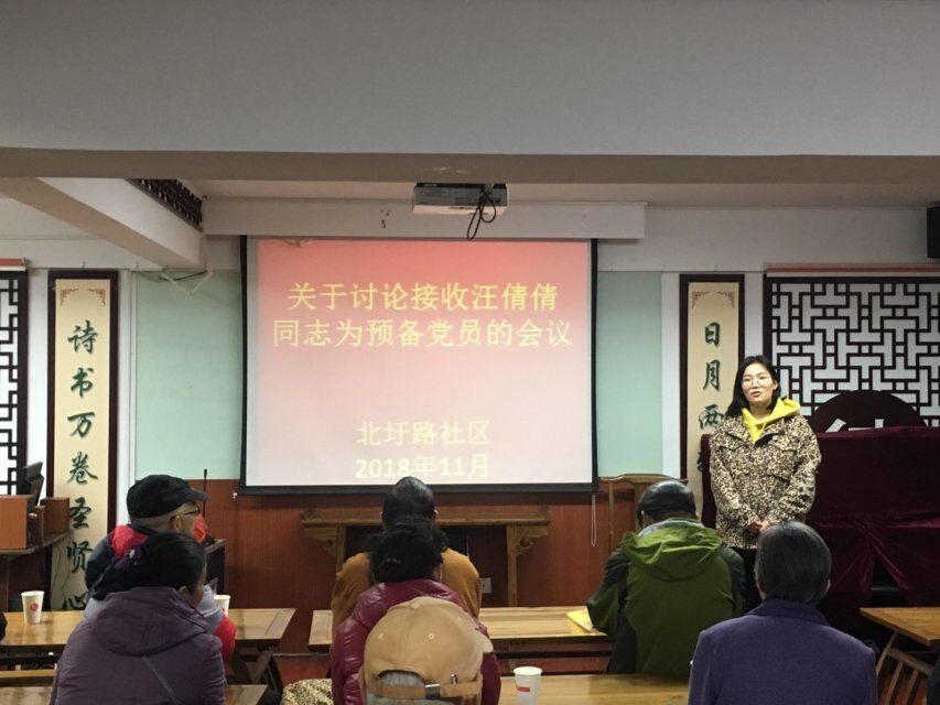 2018年11月19日下午,北圩路社区第一党支部召开了关于汪倩倩同志预备党员转正会议。本次会议严格按照党员转正的程序进行,大会应到会党员29人,实到会有表决权党员29人。