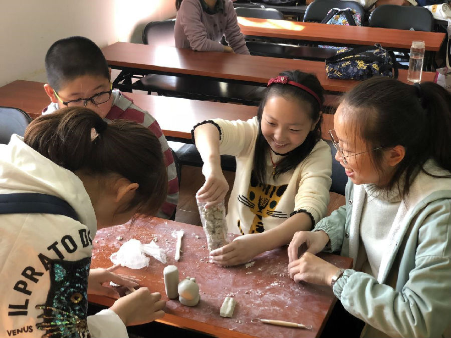 上午9:30,活动正式开始。同学们在座位上好奇地讨论着即将要做的造型,待材料分发下去之后,大家便开始兴奋地拍打按压陶泥,老师则耐心地与孩子们讨论着需要打造的泥塑形象。孩子们的想法千奇百怪,做出来的造型也千奇百怪。