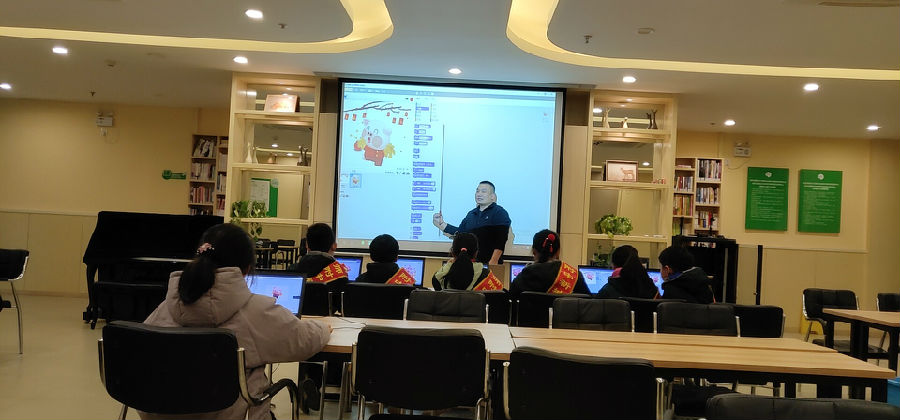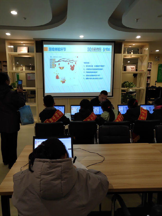 1月23日,苍山路社区组织辖区内的青少年学习计算机编程入门,新春集五福活动。