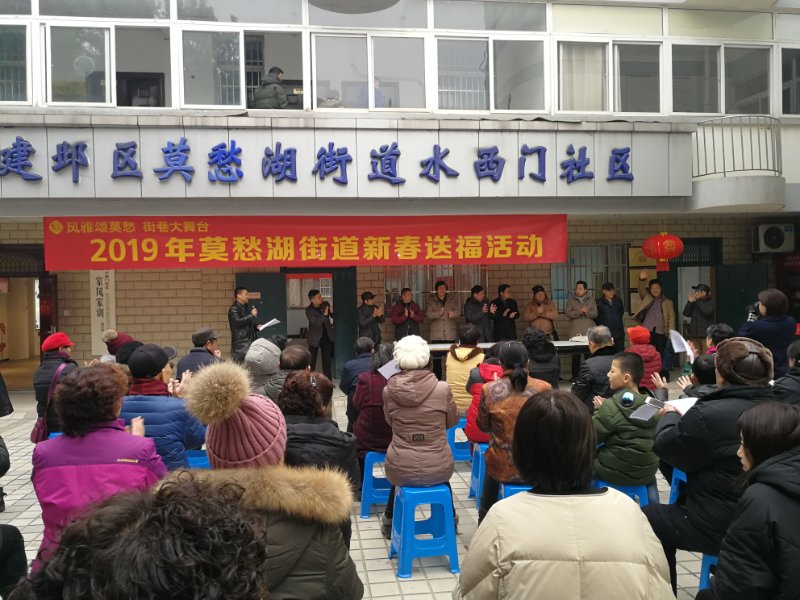 2019年元月28日上午9时,江苏省社区发展协会,江苏省楹联协会,南京市楹联家协会与莫愁湖街道共同举办的“楹联进社区,新春送祝福”活动在建邺区莫愁湖街道水西门社区举行。