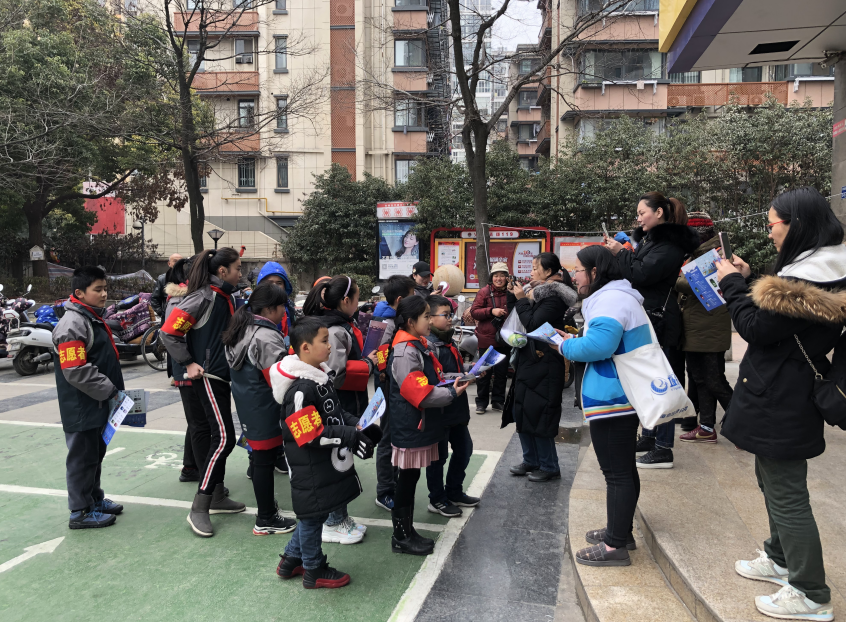 1月29日下午,莫愁湖社区组织辖区青少年走进小区、走上广场,变身文明小志愿者,开展垃圾分类宣传活动。