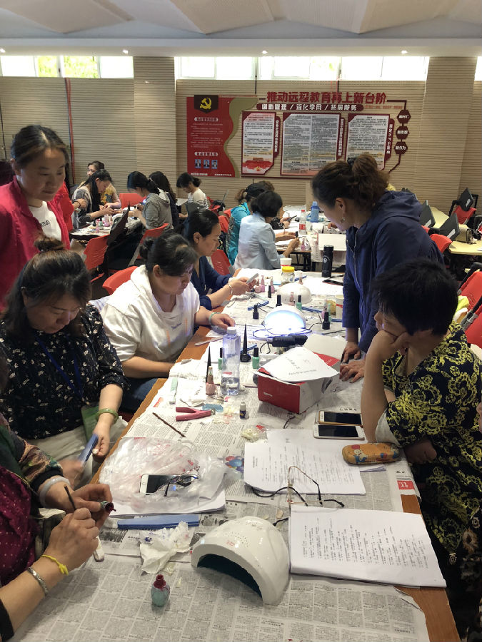 培训课上,老师从基础知识、卫生知识一直到美甲饰品和猫眼胶的制作,从理论到实践。每位居民都设计、绘出美丽生动的美甲图案,居民纷纷表示,“此次的培训,让我们学到丰富的专业知识和技能,我们一定要学有所长、学有所用。”