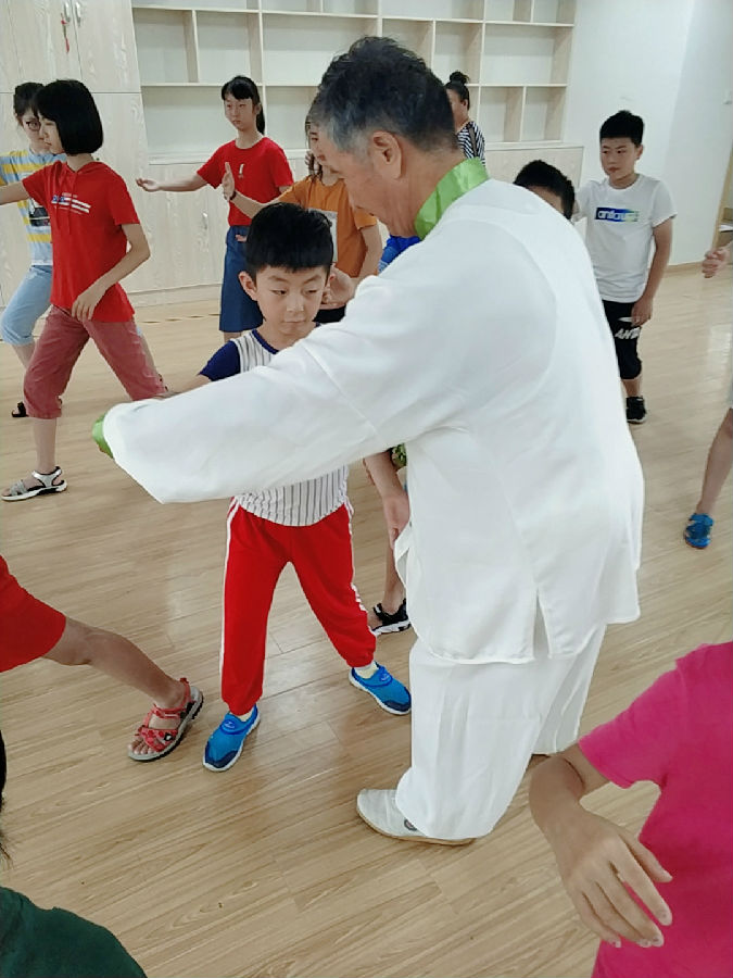 随后,孩子们在张老师的带领下来到了隔壁舞蹈室,共同学习“八式太极拳”,张老师把拳式的每一个动作都分解教学,孩子们排成四列跟着张老师的动作认真学习起来。“起势,卷肱,搂膝拗步,野马分鬃,云手,金鸡独立……”张老师边示范边讲解,由于孩子们都是零基础,必须放慢进度,张老师担心学员没信心就一个动作一个动作地慢慢教,一边教一边停下来纠正孩子们的动作,孩子们一边看张老师示范一边看着舞蹈室里的大镜子,对照自己的动作,及时纠正,别看第一排的孩子们最小,学习劲头绝对堪比青少年。张老师练习太极拳已有十余年,基本功扎实,在教学过程中,及时纠正了孩子们练习太极拳的诸多误区,并一一对他们的姿势进行指导。经过两个上午的学习,大家对太极的招式套路有了初步的掌握,也都感受到了太极的魅力,能够随着音乐翩翩起“武”了。