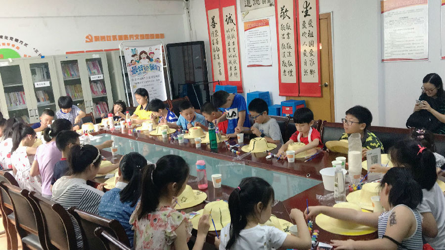 草帽DIY涂鸦听起来容易,但真正动手制作却不简单呢!活动现场志愿者手把手教小朋友们画草帽,大家动手在草帽上描绘各种图案,发挥自己的想象力,画出心中的梦想,画出快乐的心声。孩子们在社区工作人员的帮助下耐心的涂着、画着,绘制的草帽色彩斑斓、各色各样、每一顶草帽都代表着一幅梦想的画。