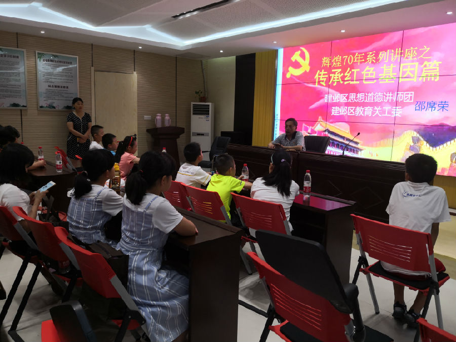 2019年7月25日下午,江东门社区组织社区数十名青少年参加辉煌70年系列讲座之传承红色基因篇。此次演讲邀请到了建邺区思想道德讲师团邵席荣先生,讲座的主题主要围绕“牢记苦难史,明白落后就要挨打”、“牢记解放史,懂得没有共产党就没有新中国”、“辉煌70年,走进新时代”、“传红色基因,圆梦大中华”四大部分展开,将国家过去、现在、未来紧密结合。邵老先生通过生动的事例向同学们讲述了当年的红色故事,他希望同学们珍惜今天的幸福生活,时刻学习先辈的无私精神,好好读书,长大后成为社会的有用之才。从红色文化、红色基因中汲取前行的力量,坚定理想信念,听党话跟党走,成为担当民族复兴大任的时代新人。最后邵老先生教导学生在未来的学习生活中,一定要“多学”、“多看”、“多想”、“多问”,共同为祖国的繁荣昌盛增光添彩。