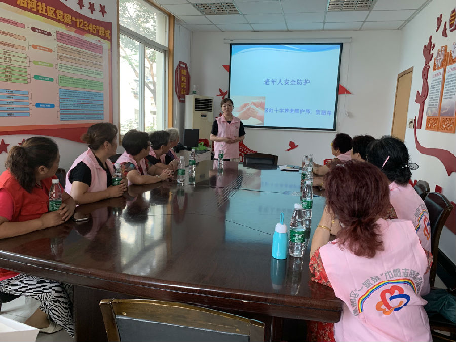 为发扬“人道、博爱、奉献”的红十字精神,提升志愿者应急自救能力,2019年7月25日下午,沿河社区联合南京市建邺区红十字会共同开展安全防护知识培训,参与此次的培训的是社区内的10余名巾帼志愿者,本次培训邀请到建邺区红十字养老照护师贺丽萍老师担任主讲人。