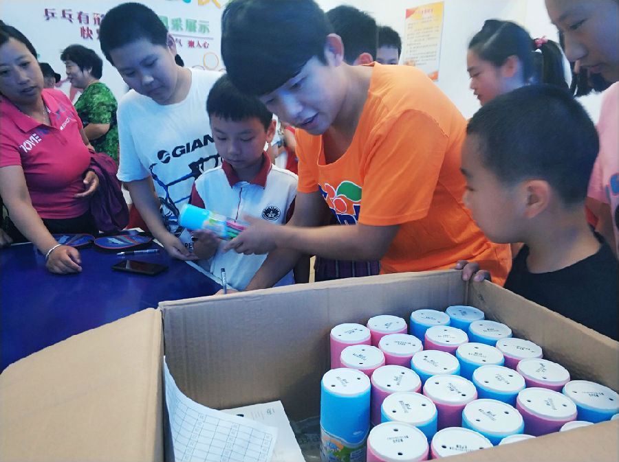 乒乓球是中国的“国球”,志愿者贾老师先让孩子们说出自己认识的乒乓球奥运冠军,孩子们争先恐后的说“张继科,大魔王”,“邓亚萍最厉害”,还有张怡宁、马龙、王皓……,可见孩子们对乒乓球的喜爱。现场氛围愉快热烈,小选手们个个精神饱满、斗志昂扬,挥动着手中的球拍,与对手展开激烈的角逐。此次比赛本着“友谊第一、比赛第二”的宗旨开始赛程,比赛以身高分组,通过预赛、半决赛和决赛决定排名。活动中,“小小运动员”们精神饱满,挥动着球拍,你来我往开心地较量,水平不分上下,过程既紧张又兴奋。小小的乒乓球飞来钻去,以小球推大球,以比赛助友谊,传递着和谐、友谊和快乐。围观的同学和家长们也没闲着,为参赛选手加油、助威、呐喊,有的都情不自禁的当起了小裁判。