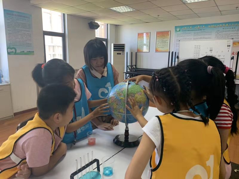 在实验的过程中还涉及到了一些国家的名字和地名,老师让孩子们在地球仪上找到,带动他们多科学习的兴趣。这不单单是实验,这是一场科技、物理、生物、地理等等方面的融合,孩子们学的不亦乐乎。
