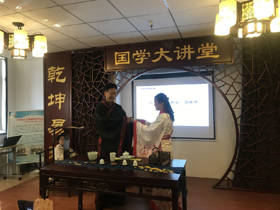 走进兴隆街道国学馆,古色古香的桌子上已经摆上了成套的茶具。徳教仁海资深礼仪老师给两位市民穿上了汉服。茶道礼仪也从汉服说起。首先,饮茶的着装要讲究,给人庄重的感觉。给客人敬茶要双手举到客人面前。接受敬茶的人也要双手接受。表示尊重。在老师的带领下,大家学习了敬茶礼。