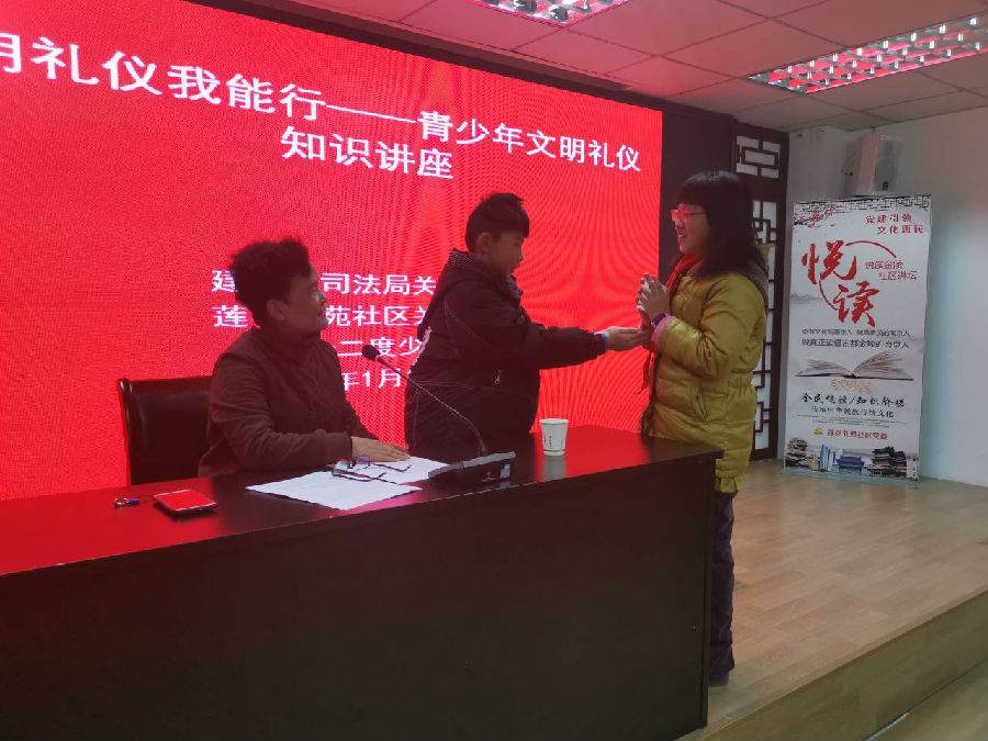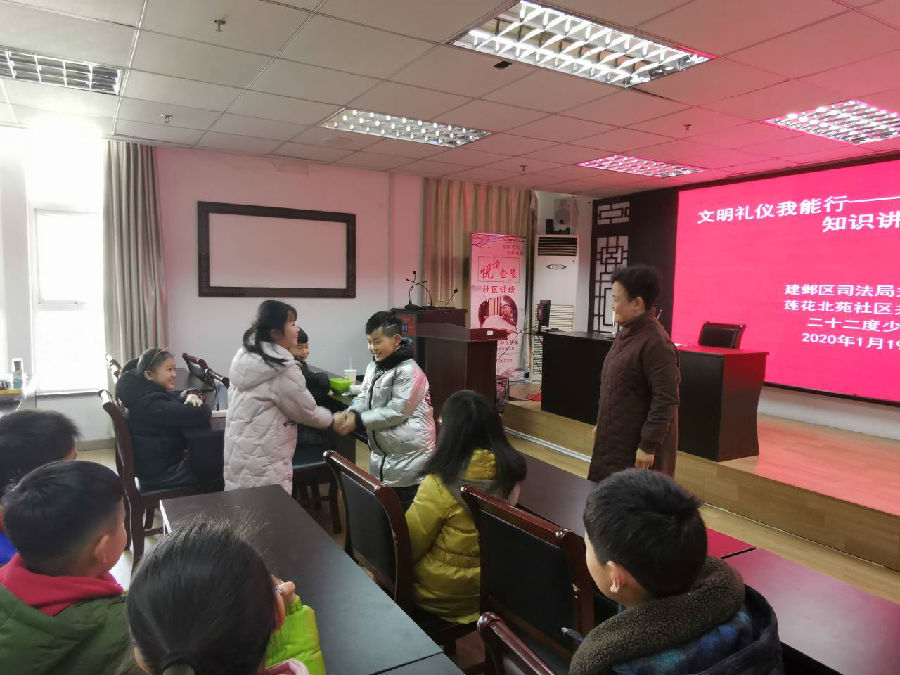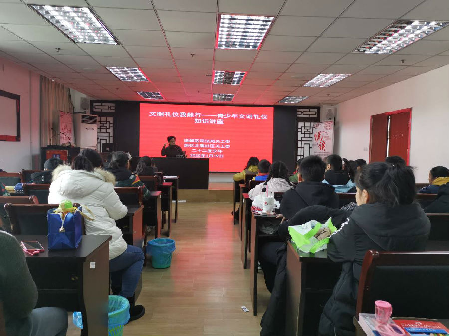一年一度的我国传统佳节春节即将到来,2020年1月19日,建邺区司法局关工委和莲花北苑社区关工委联合南京市二十二度青少年服务中心在莲花北苑社区四楼活动室为辖区青少年开展了“快乐假期,喜迎新春”文明礼仪知识讲座,主讲人建邺区司法局关工委成员周晓红老师。