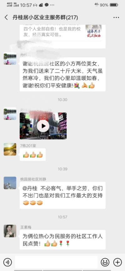 住在丹桂居小区17幢居民在微信群中求助,社区工作人员方慧看到后立马联系,得知是一对独居的夫妻,他们表示家中存粮所剩无几,无奈夫妻二人年龄大腿脚不便买不了米,子女也无法就近照顾,立刻为老人买米并约定送货上门。
