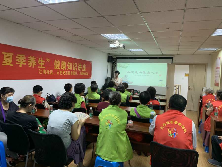 为了提高社区志愿者的保健意识,倡导科学、合理、健康的生活方式,7月14日上午,江湾社区联合巾帼创客家公益服务中心在社区二楼会议室为社区五色光志愿者们带来了一场精彩的夏季养生知识讲座,共有30名志愿者参加了本次活动。活动现场老师从夏季养生原则、夏季养生起居、夏季养生运动、夏季常见疾病预防等方面进行了生动的讲解,并指导大家如何做好日常生活中的饮食营养搭配。此次活动加深了五色光志愿者对夏季养生知识的了解,提高了大家的健康意识和自我保健能力。