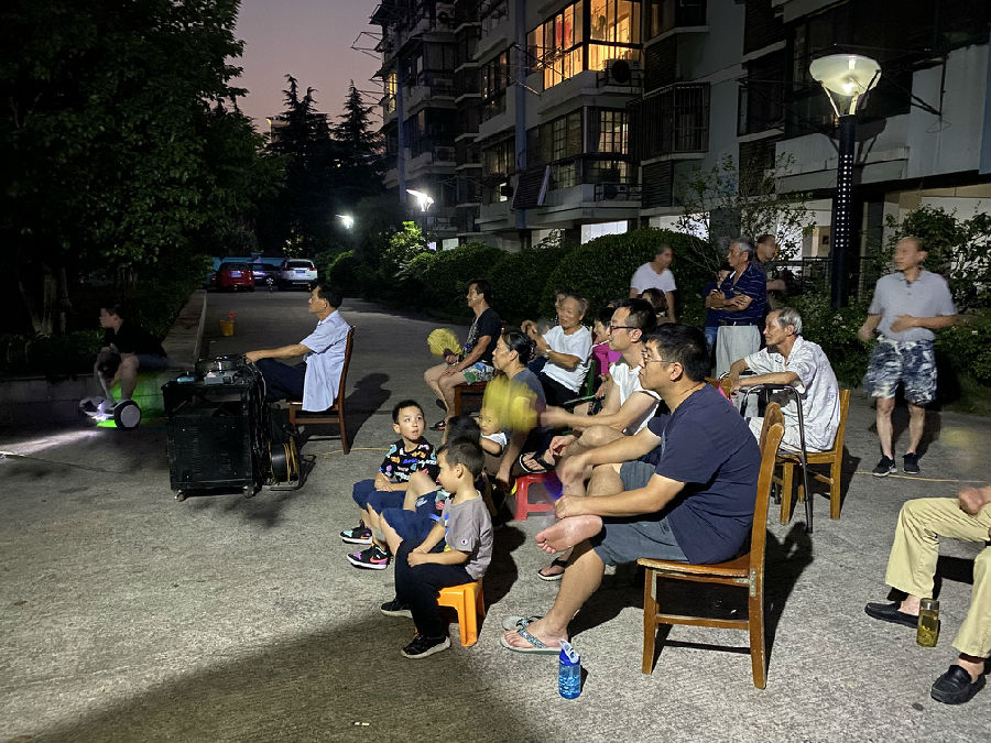 为了能有最佳的观影效果,放映工作人员早早地就在小区里忙活起来了,拉电线,升幕布、调音响,积极为放映作好准备。夜色袭来,居民们携老带幼早早来到广场,等待电影放映。晚上7点电影准点开播,小朋友排排坐好,聚精会神盯着大屏幕,看得津津有味。老人和家长们一边摇着扇子一边观看着精彩的影片情节,时不时还谈论下剧情。