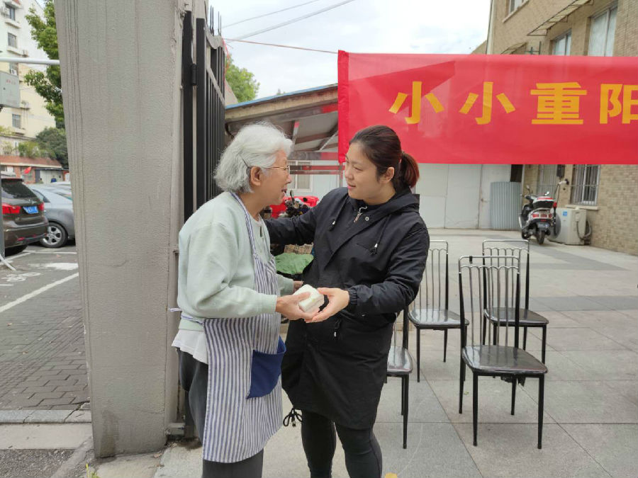 社区居委会主任舒李淳带领社工在负责分发敬老重阳糕,同时送上重阳节日的问候和祝福,使老人们沐浴着社会关怀、爱的阳光,心里暖洋洋的。对于参加活动的孤寡老人、残疾老人,社工们亲手送上重阳糕和亲切的节日问候祝福外,还会俯下身去与老人聊聊天、询问需不需要社区帮忙。老人们接收着重阳糕和问候祝福,幸福的笑容洋溢在脸上。