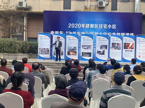 为提升社区居民安全用电意识,杜绝“飞线充电”现象,2020年11月17日下午,2020年建邺区住宅小区电瓶车“飞线充电”突发火灾应急救援演练在凤栖苑社区广场开展,此次演练活动由建邺区安全生产委员会主办、建邺区应急管理局和莫愁湖街道办事处承办。