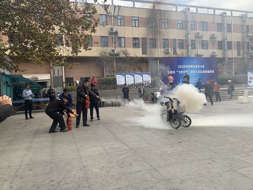 活动现场,突发火灾应急救援专业人员向在场的居民讲解“飞线充电”的危险性、火场如何逃生救援和灭火器的正确使用方法,现场演练如何扑灭电瓶车着火。