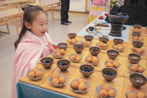 活动开始,先是由公益活动的老师讲解冬至的有关习俗,以及人们在冬至日进行的一些活动。特别介绍了在老南京,文人雅士会相约九人饮酒,席上用九碟九碗,成桌者用“花九件”席,举办九九消寒会,饮酒喝茶赋诗。接着,孩子们拿出自己准备好的与冬至有关的诗词进行诵读,小朋友们绘声绘色的表演受到家长们的高度赞扬。活动最后,由家长和孩子共同制作美食糕点,孩子们根据自己的喜好,制作出不同形状的糕点,并进行品尝。