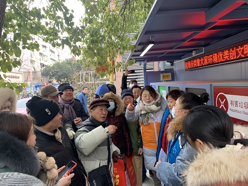 社区工作人员联合街道垃分办的工作人员现场给居民发放垃圾分类宣传折页,并指导如何通过手机扫码注册“宁积分”。在广场宣传的同时,实地带领居民了解垃圾分类箱的正确使用方法,并通过有奖问答的形式让居民掌握垃圾如何正确分类的小知识,现场气氛热烈,虽然天气寒冷,但大家积极参与的热情高涨。