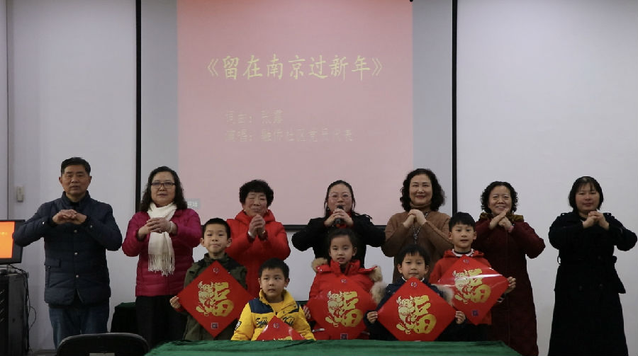 为响应国家“就地过年”号召,融侨社区热心居民张露创作了原创歌曲《留在南京过新年》,并于2月5日下午组织辖区党员、居民与青少年合唱这首欢快的歌曲。