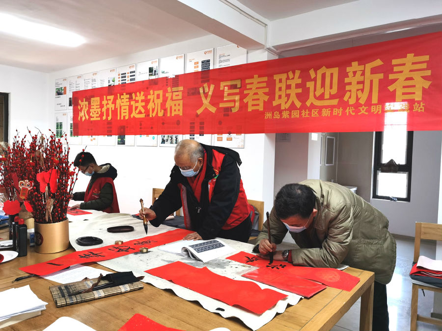 2月6日上午,南京洲岛紫园社区新时代文明实践站联合“紫艺花”清新书画院的书法志愿者们开展“浓墨抒情送祝福义写春联迎新春”活动,为辖区居民送上春联和节日问候,活动共送出春联130余副。