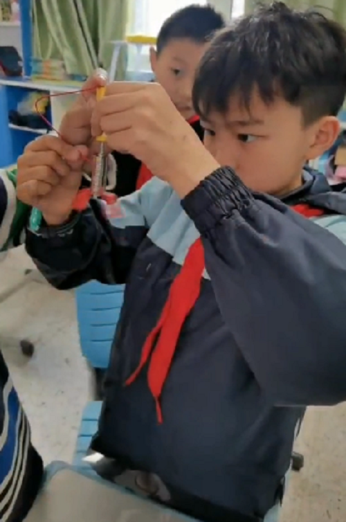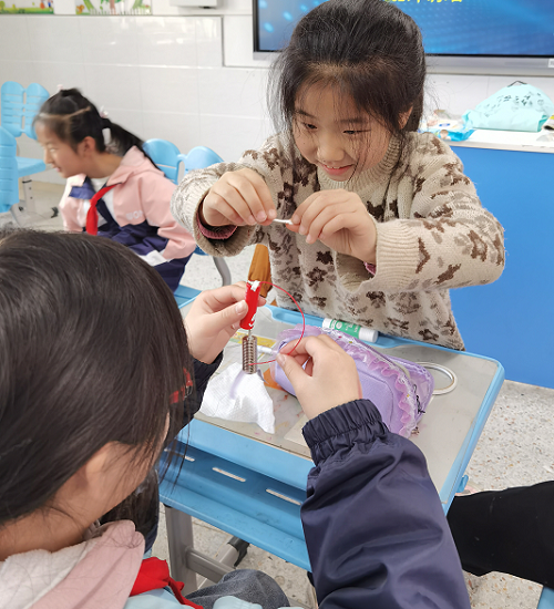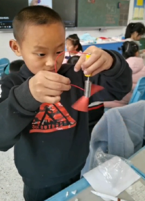 实践环节开始了,老师先给小朋友们分发材料包,在制作的过程中,孩子们个个聚精会神,小心翼翼地将零件仔细地拼装起来。连接电线、固定扇叶步骤的难度系数较大,非常考验同学们的耐心和细心。提前做好发电机的小朋友做起了小老师,帮助遇到实验困难的同学,在孩子们的努力下,手里的发电机陆陆续续成功安装好,风扇就可以转起来了。