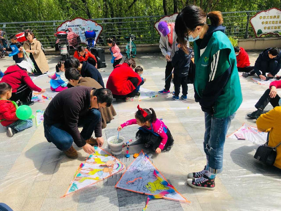 动开始前,“乐享”环保巾帼志愿者倡议大家多多关注我们身边的环境污染问题,号召大家节约能源、绿色出行,从小事做起,让我们的大地更绿、天空更蓝、生活更美。随后,志愿者为现场的每一组家庭分发手绘风筝的材料,家长带着孩子随着自己想象把对生态环境的期许涂鸦在空白的风筝上。活动现场欢声笑语、热闹非凡。虽然大家都缺乏手绘风筝经验,但是家长和孩子们充满热情,大家相互交流自己的想法,分享自己的喜悦。不一会儿,各具特色的风筝就出现在了广场上,这些风筝都是孩子们想象力的结晶。一幅幅栩栩如生的动物、色彩斑斓的植物在他们的画笔下活灵活现,用颜色点缀着创意,用图案装点天空,用幸福迎接暖春。