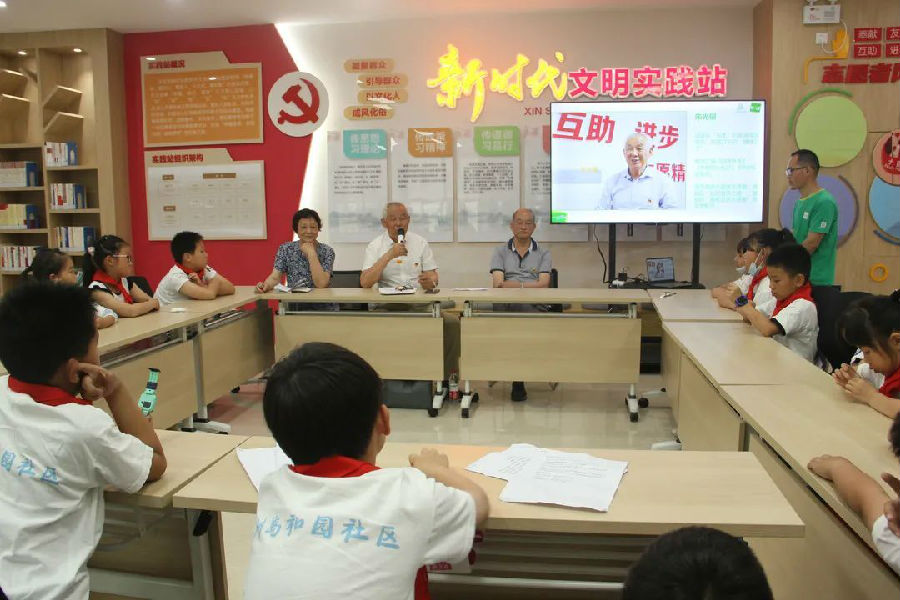 洲岛和园社区邀请社区三位老党员,他们分别是“江心洲的全天候全科医生”张旭东爷爷,“居民口中的健康卫士”朱光银爷爷,在关心青少年健康成长事业中积极发挥党员榜样力量的魏美瑩奶奶。老党员与孩子们面对面,回顾他们作为一名榜样党员,学以致用、服务于民的故事,同时,分享了中国共产党百年光辉历程中学习强国的榜样故事。工作人员带领先锋少年走进原江心洲公社党委书记韩荣贵家中,听韩老书记讲述江心洲的发展史,聆听他为民服务的故事。