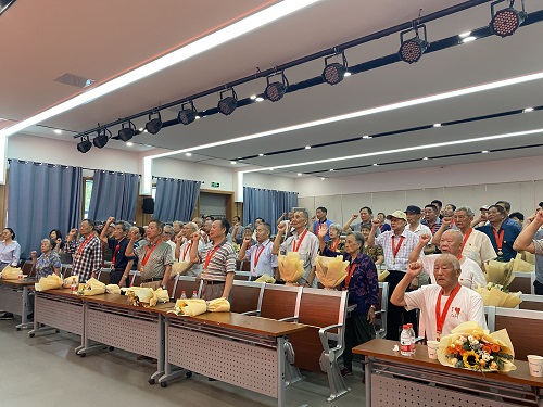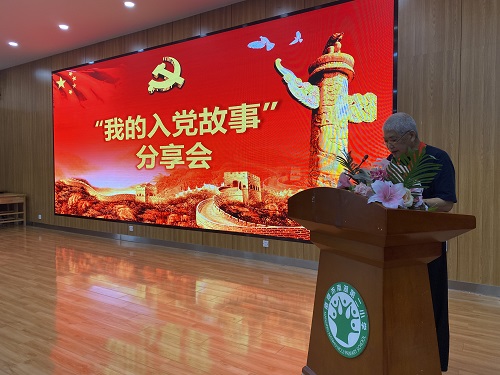 活动开始,在铿锵激昂的进行曲中,伴随着台下有节奏的掌声,老党员着装整洁,接受着属于他们这最光荣的时刻。杨红静书记依次为党员们戴上“光荣在党50年”纪念章,并送上鲜花。随后,50年党龄的党员代表黄雍德、姜明华、许海宾向大家分享了入党故事和学习党史的体会。党员代表黄雍德同志向大家分享了入党时参加战争经历,并激动地说道:“得到这枚纪念章是我的荣誉,我倍感荣幸,我将保持作为一名党员和老兵的精神血脉,激励自己在新时代的征程上继续前进并始终跟党走!”