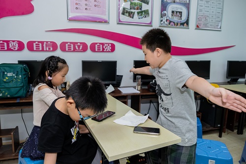 在理论知识讲解完后,小导游们分成五小组,开始讨论各组主题,随后便开始进行拍摄创作,小导游们一个个化身小小摄影师,姿势动作有模有样,组员之间相互合作,“你可以这样……”、“老师,你能帮我……”、“……”拍摄进行得热火朝天。