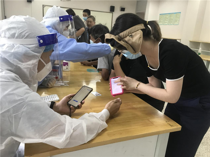 在引导区和检测区,江心洲街道城管科、安监科和环保科等部门工作人员忙碌的身影随处可见,检测区的三个检测位分别配备了一名医护工作者,两名信息登记员和一名志愿者引导员,核酸采样正高效推进。“虽然我们这个检测点只有五名医务人员,但是分组运作的高效模式,却形成了效率最大化的效果。”江心洲街道办事处副主任孙花介绍,街道组建了一支由90后社工组成的采样登记志愿服务队,年轻的志愿者们克服困难,迎难而上,连续奋战,大大提高了医务人员的采样效率。
