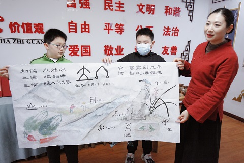 活动中,用明代沦茶法为蓓蕾社区青少年,制作的立冬节气茶,让社区青少年耳目一新。社区青少年伴着立冬节气的诗卷,品尝着节气美食,通过甲骨文字画感受立冬节气,特殊的美。
