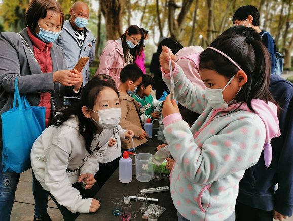 穿过幽静的木栈道便是活动的第二站——水质勘测实验“室”。实验老师首先向社区小居民们讲解了实验指标的定义及意义,在老师示范操作后,大家在妇联巾帼志愿者的协助下开始动手进行实验,水质监测对整个水环境保护,水污染控制以及维护水环境的健康十分重要。在本次自然小课堂中,简单有趣的小实验,让大家理解了影响水环境的因素,认识了水体中存在的污染物的种类。