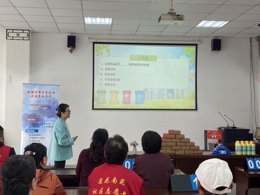 本次活动分为两个环节。首先进行的是垃圾分类知识竞赛,共有5支队伍参加。选手们个个积极参与,每支队伍反应迅速,回答正确率极高,角逐激烈,难分伯仲,大家充分运用自己丰富的垃圾分类知识和生活实践,与队友密切配合,将比赛一次次推向高潮。社区也通过发放小礼品,为竞赛添上乐趣。活动间隙,社区经济工作专职工作人员向小区居民介绍《南京市信用条例》,并强调 了信用的重要性,特别针对莲花南苑小区居民本地拆迁居民较多,针对资产使用、贷款等情况做了细致介绍。
