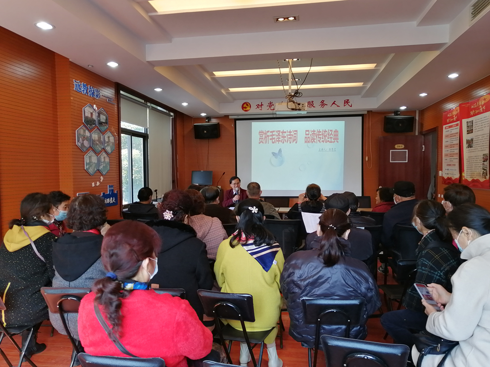 重温红色经典,品味幸福生活,11月25日,兴达社区组织党员和居民群众,在社区会议室举办了“赏析毛泽东诗词 品读传统经典”红色经典阅读进社区活动。主讲老师厉恩宝,声情并茂讲述了毛泽东各个时期的诗词。诗词中渗透着毛泽东思想哲理,是毛泽东文艺思想亲自实践的范例。从创作背景、诗意赏析、典故出处注释等详尽资料中欣赏毛泽东诗词“湖海荡波澜,全无斧凿痕”之美。各位党员和居民表示受益匪浅,毛泽东的诗词可以说是20世纪中国革命的一个缩影,是我国文学宝库中的瑰宝。