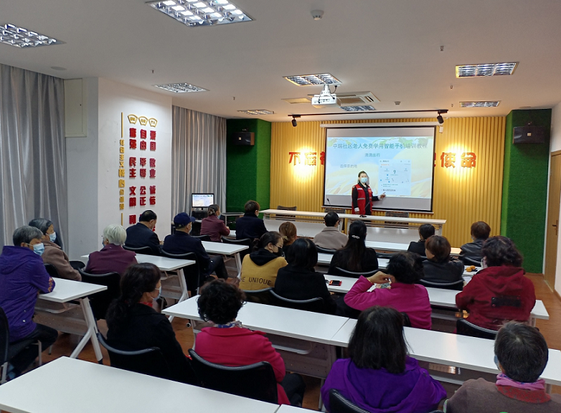 2021年11月19日,中瑞社区开展了第二堂老人学用智能手机课程,邀请辖区志愿者胡老师为居民们讲解。