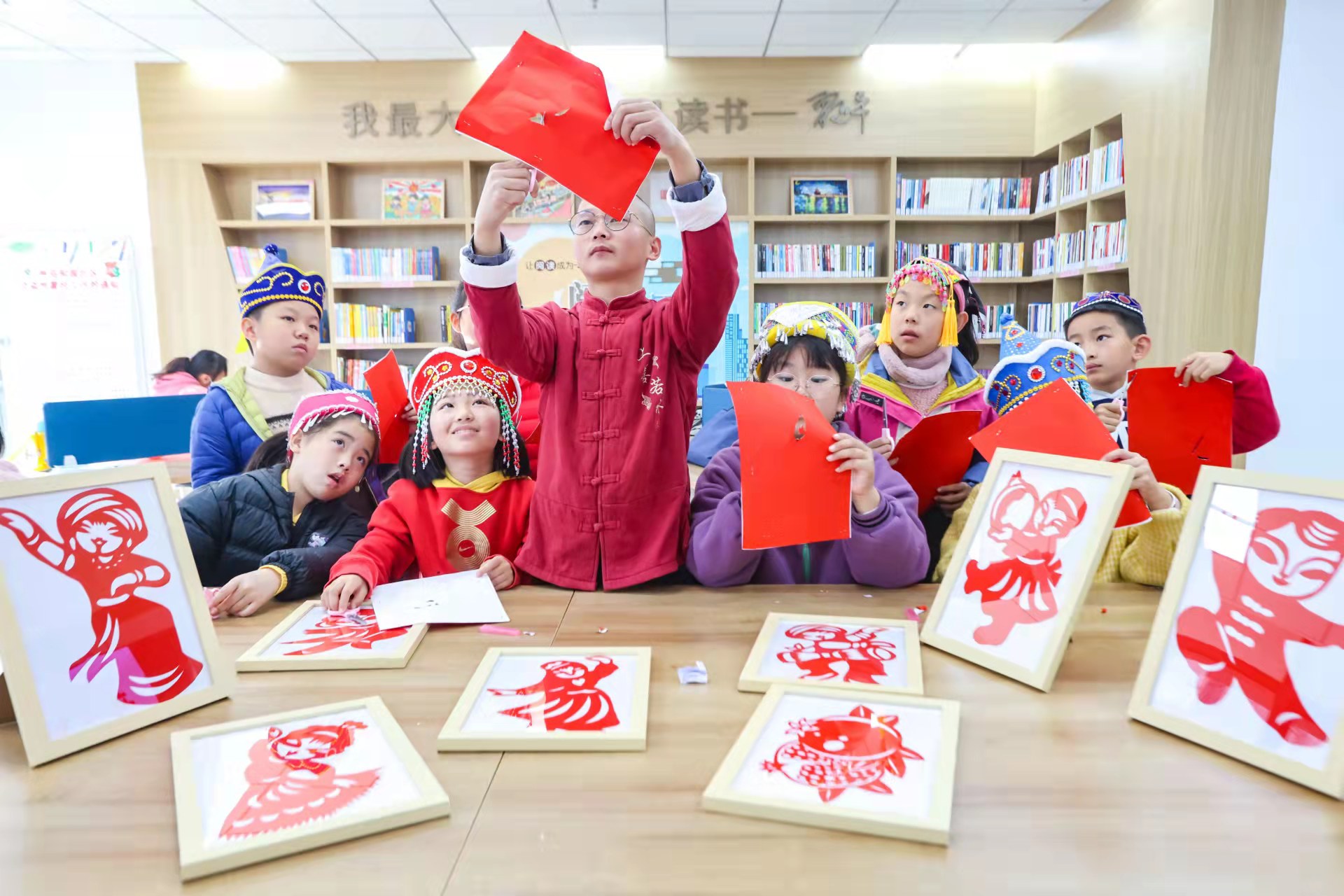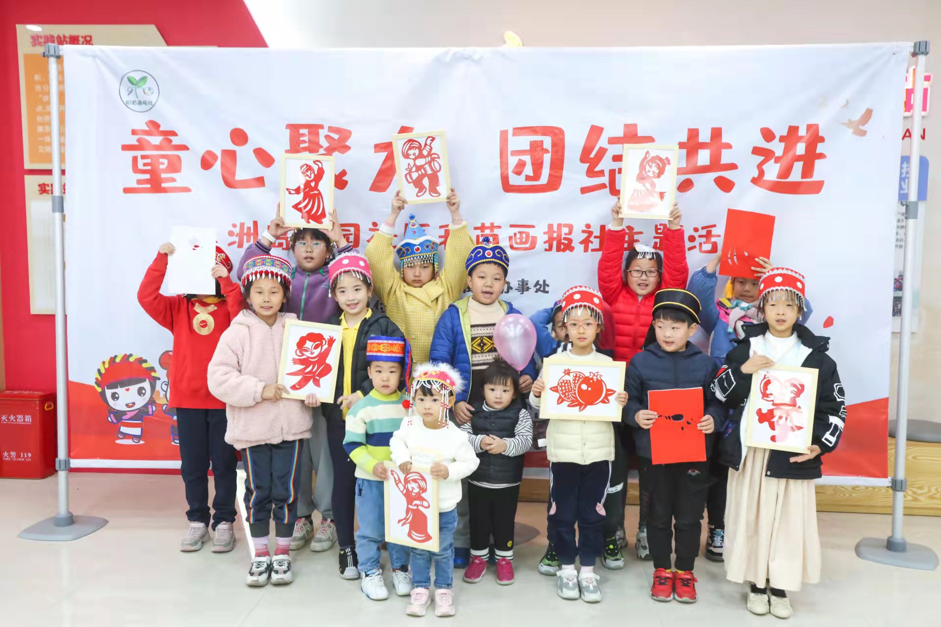 剪纸活动结束后,工作人员又为孩子们分发了彩笔和挂画底稿,老师为孩子们介绍了各民族服饰的特点和历史文化,教孩子们制作民族挂画。少年们根据所学,积极实践,充分发挥想象力,用多彩画笔描绘民族画,经过搭配、创作,纷纷完成了自己的作品。洲岛和园的少年儿童戴着少数民族的帽子,将自己的剪纸和挂画作品装饰在幸福、和谐、团结、互助的“红石榴家园”里,并拍照合影留念。