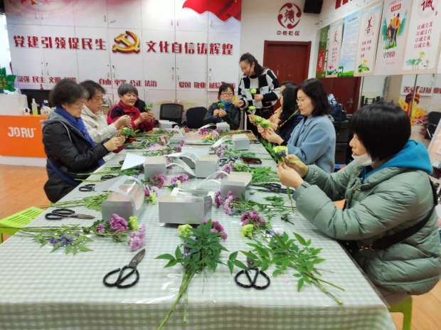 女红老师准备了不同品种的花,包括康乃馨、满天星等等。活动中,老师一边向参加者们讲解一边示范制作过程,参加者们一个个都听得很认真。轮到大家制作的时候,居民们对每个步骤都一丝不苟,不明白的地方还积极向老师提问。看似简单的步骤,上手却不太容易,在女红老师的反复演示后,在场的居民朋友迫不及待地进行操作,认真做起了手腕花。在小组活动过程中,小组共学习了康乃馨、菊花等多种手腕花的制作。各位居民发挥了自己的奇思妙想,将不同种类的花结合到一起,组成了造型别致的手腕花。不一会的功夫,一个个五彩斑斓的手工花便呈现在大家面前,参与者们欣赏着自己的作品,脸上露出了灿烂的笑容。尽管部分手工零件材料较小,有的居民操作起来稍有困难,但在工作人员的耐心协助下,每一位居民都顺利完成了自己的作品。